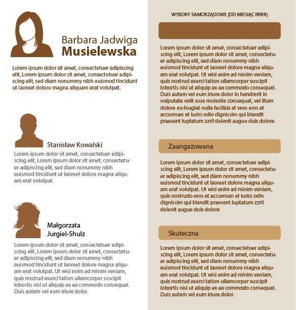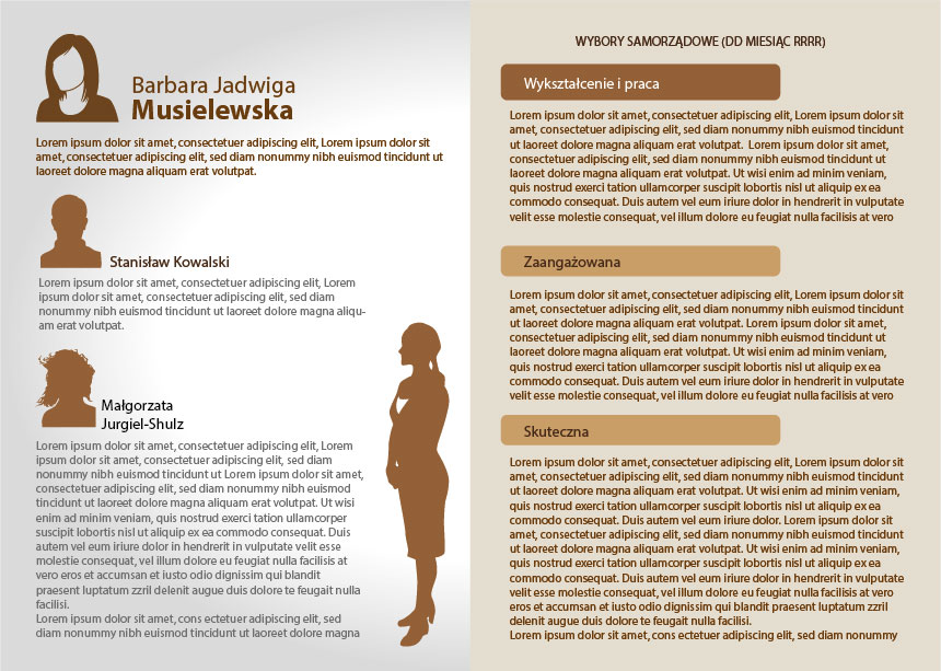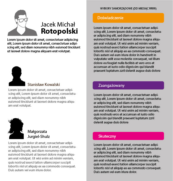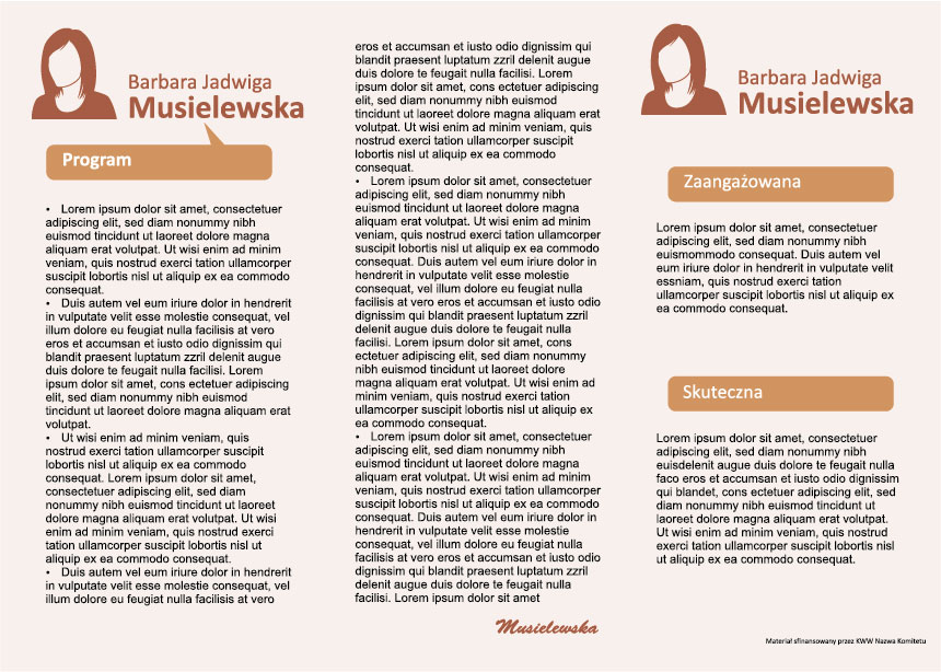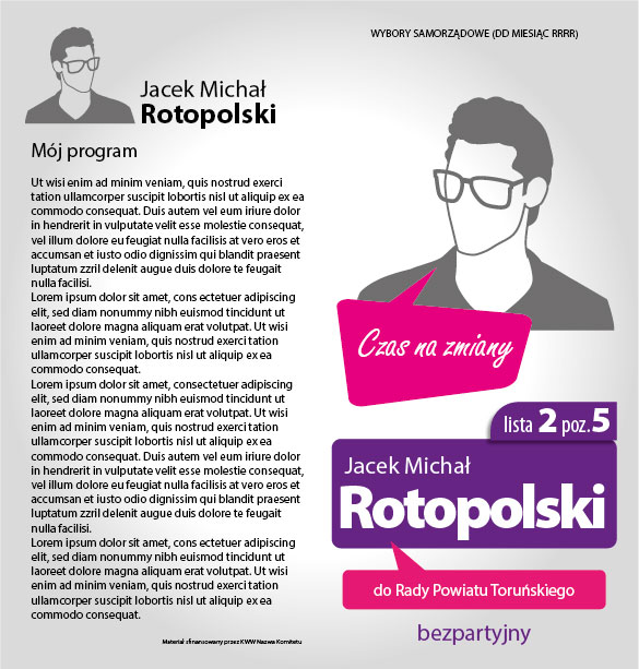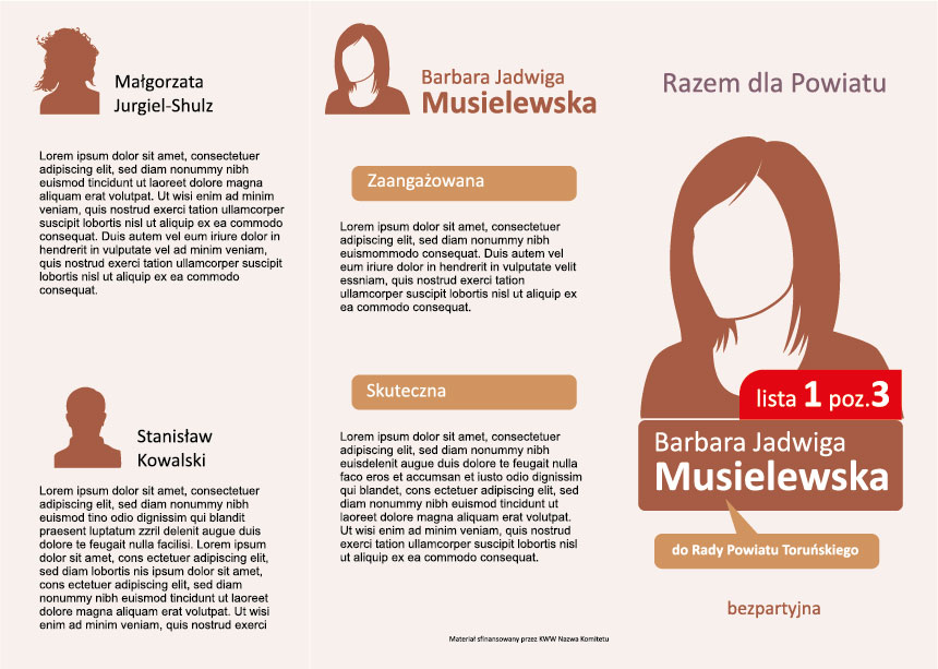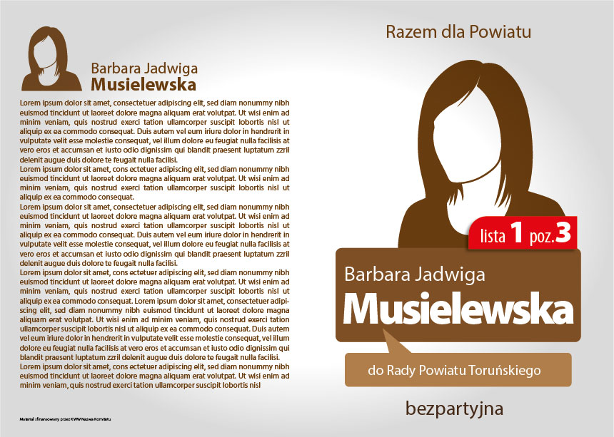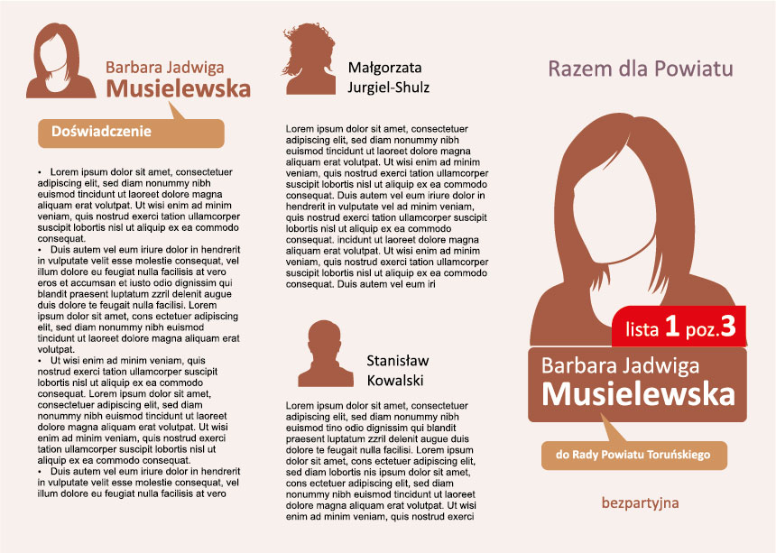 Wydrukowane dwustronnie w pełnym kolorze na wysokiej jakości błyszczącej kredzie 135g ulotki wyborcze to najpopularniejszy sposób na zaprezentowanie kandydata. Jeśli nie masz projektu ulotki prześlij nam swoje zdjęcie oraz treść jaka ma się na niej znaleźć (wszystkie materiały muszą być w wersji elektronicznej), określ kolorystykę ulotki, a przygotujemy projekt dla Ciebie.